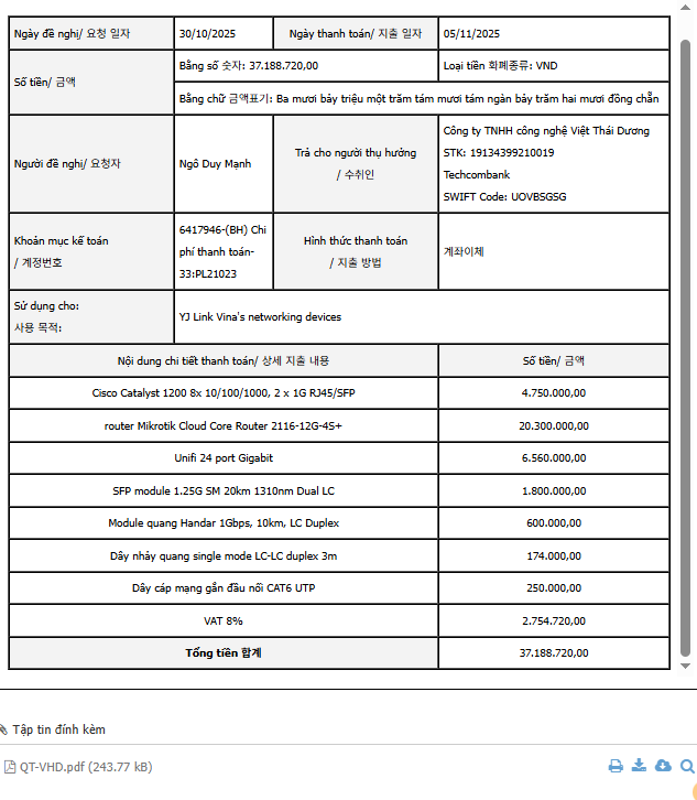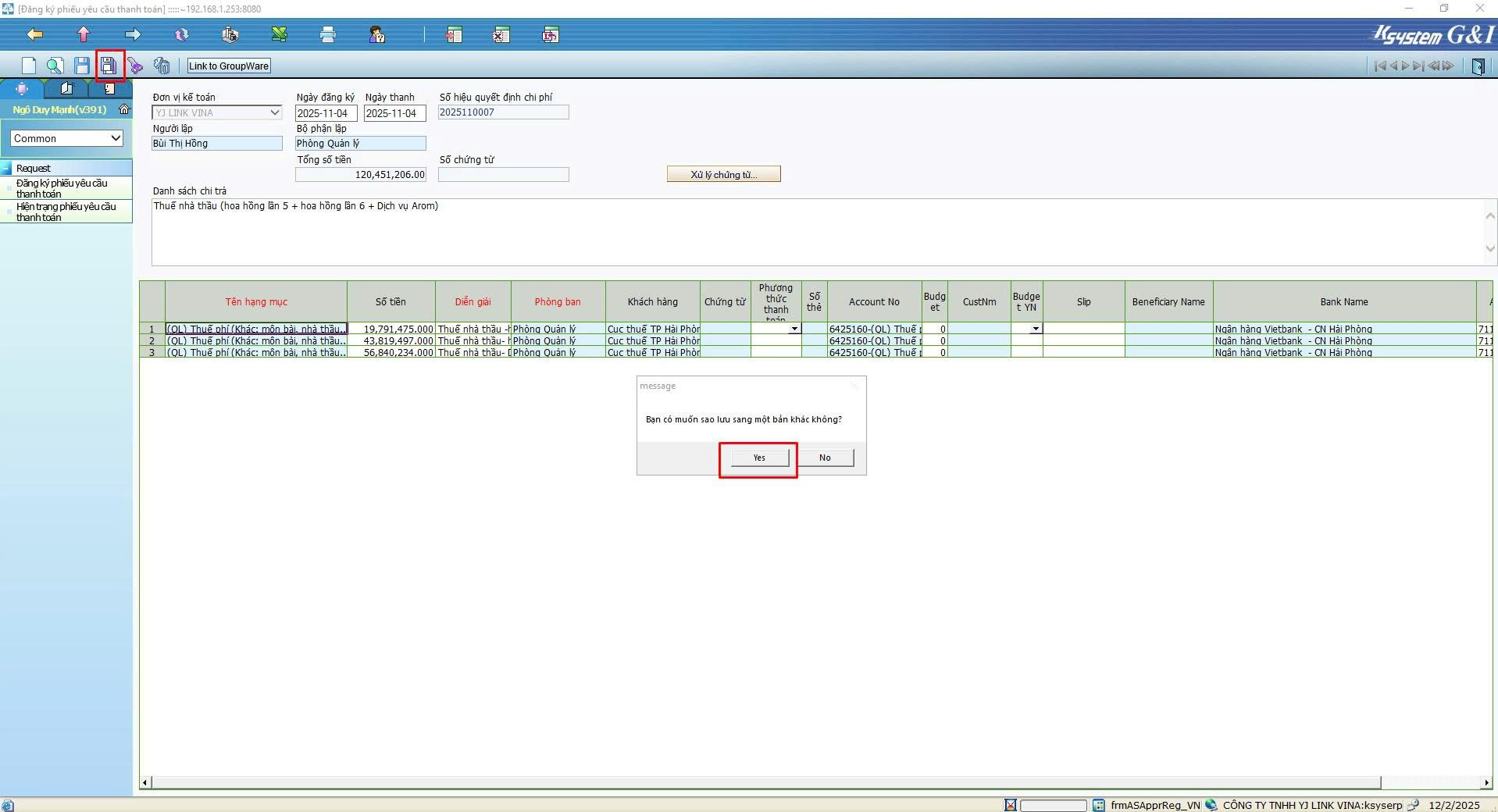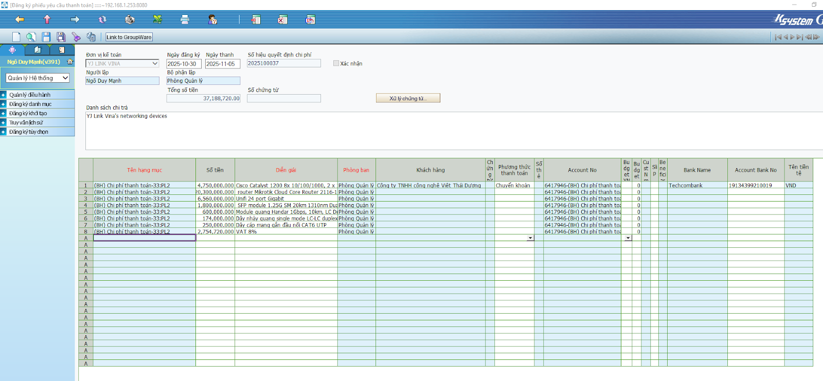 Chú ý: nếu sửa đề xuất sau khi gửi duyệt trên Hanbiro không thay đổi số tiền , người nhận nếu không sẽ lệch dữ liệu với ERP