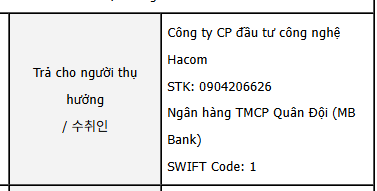 *Khách hàng/ beneficiary name , Account Bank No,Bank Name : chỉ cần nhập ở dòng số 1