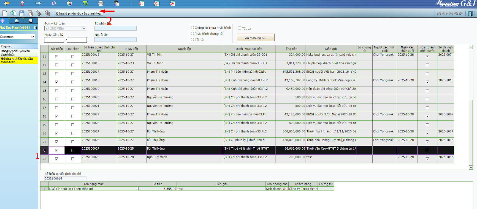 3. Hiện trạng yêu cầu thanh toán: xem lại danh sách yêu cầu phê duyệt. Yêu cầu được phê duyệt sẽ trả về trạng thái xác nhận trên ERP.