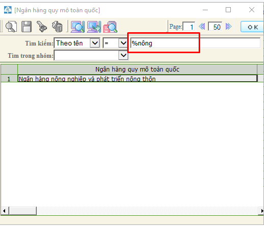 Bank Name* : nhập % + chữ trong tên đầy đủ của ngân hàng để tìm kiếm: